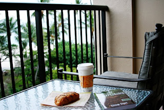 And here is a photo of how I started my morning out today...could there be anything better than sitting on a hotel balcony with a view of the ocean with a vanilla latte and chocolate croissant, and a new book?!